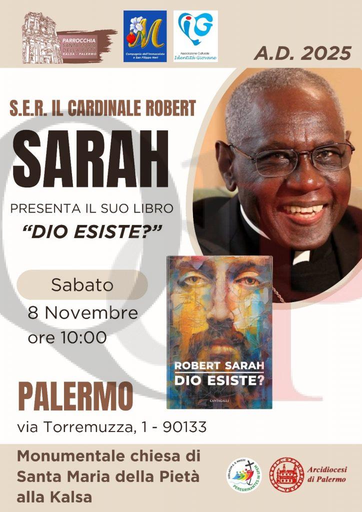 Il Cardinale Robert Sarah sarà a Palermo per presentare il suo ultimo libro “Dio esiste?”, edito da Cantagalli. L’appuntamento è per sabato 8 novembre alle ore 10, presso la monumentale chiesa di Santa Maria della Pietà, in via Torremuzza, nel rione della Kalsa a Palermo.