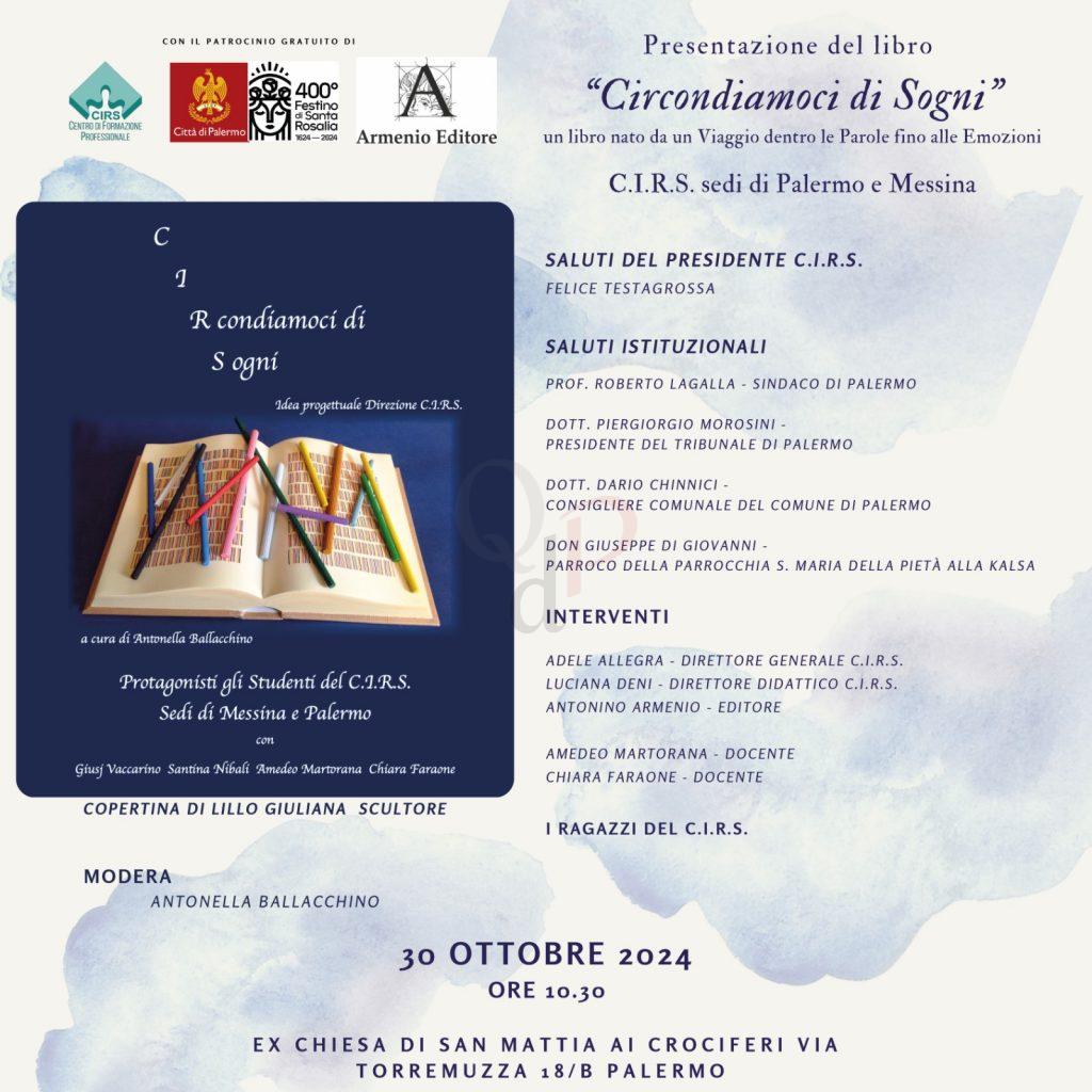 Dopo l’incontro tenutosi al Palazzo dei Leoni di Messina, il libro dal titolo “Circondiamoci di Sogni” approda a Palermo, dove sarà presentato mercoledì 30 ottobre alle 10:30 nell’ ex Chiesa di San Mattia ai Crociferi, in via Torremuzza 18/B.