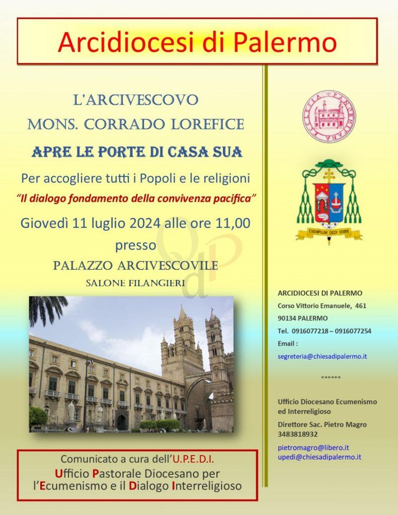 L’Arcivescovo Monsignor Corrado Lorefice aprirà le porte di casa sua, per accogliere simbolicamente tutti i popoli e le religioni negli spazi del Salone Filangieri del Palazzo Arcivescovile, in via Matteo Bonello 2 a Palermo.