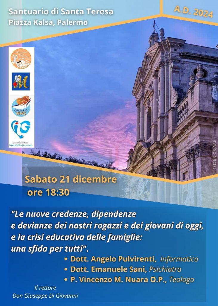 L’appuntamento è per le ore 18.30, al Santuario di Santa Teresa nel quartiere della Kalsa, a Palermo. Ad organizzarlo l’”Oratorio Vivo”, voluto dal parroco Don Giuseppe Di Giovanni sulle orme di San Filippo Neri e San Giovanni Bosco, fondatore dei Salesiani. Il tema sarà approfondito dagli interventi dell’informatico, Angelo Pulvirenti; dello psichiatra Emanuele Sani e del teologo Padre Vincenzo Maria Nuara O.P.