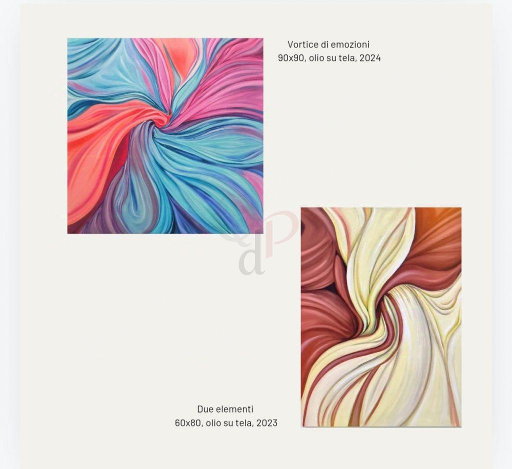 L’esposizione raccoglie quindici tele, tutte realizzate a olio, dalle intense e vivaci cromie che danzano e si intersecano generando originali drappeggi e nodi, quasi a formare tessuti, in un intreccio morbido e sinuoso dalla particolare resa volumetrica, che conferiscono all’opera eleganza e flessuosa armonia.