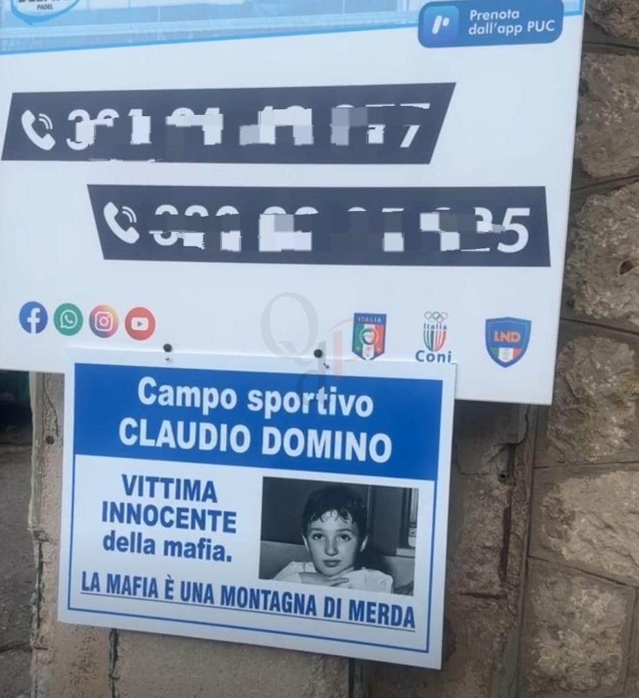 Atto di forza questa mattina all’Arenella da parte del deputato regionale Ismaele La Vardera e della consigliera comunale Giulia Argiroffi che stamani si sono recati davanti all’ingresso del campo sportivo Rosolino e Giuseppe Lo Cicero, che ospita la scuola calcio Asd Delfini Sporting Arenella, e hanno inchiodato al muro una nuova targa dedicata a Claudio Domino, 11enne ucciso dalla mafia il 7 ottobre del 1986 nel quartiere San Lorenzo di Palermo.
