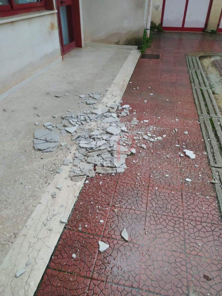 “Tragedia sfiorata! Intonaci esterni che dovevano essere ripristinati nelle vacanze natalizie sono ancora pericolanti in aree non transennate. I ferri non sono trattati. Cantiere fermo”.