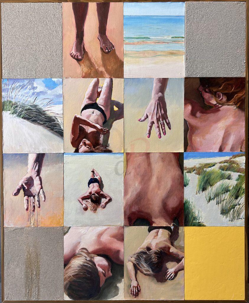 “In questo viaggio – osserva Sabrina Di Gesaro –  ogni pannello è una tappa, un pezzo del puzzle che compone una visione complessiva dell’arte come esperienza totalizzante e multisensoriale: i tasselli dei suoi quadri polittici sono frames, frequenze di immagini tratte da un film, accostamenti di foto come un feed di instagram”.
