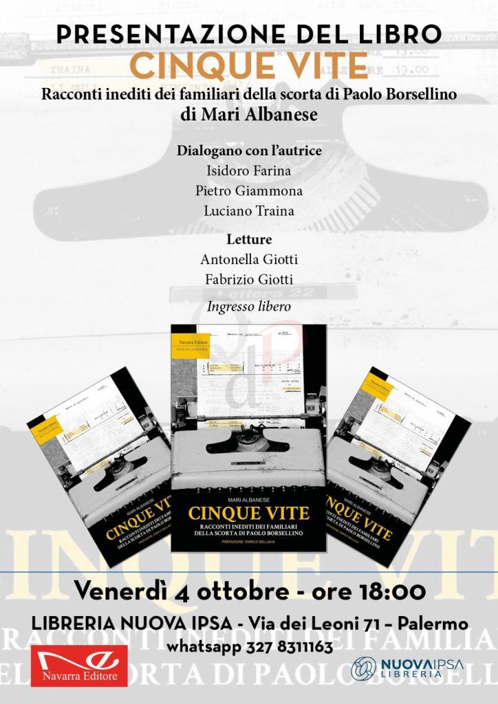 “Cinque vite. Racconti inediti dei familiari della scorta di Paolo Borsellino” : è il titolo del libro di Mari Albanese che sarà presentato a Palermo, negli spazi della Libreria Nuova Ipsa, in via dei Leoni 71 venerdì 4 ottobre alle 18:00.