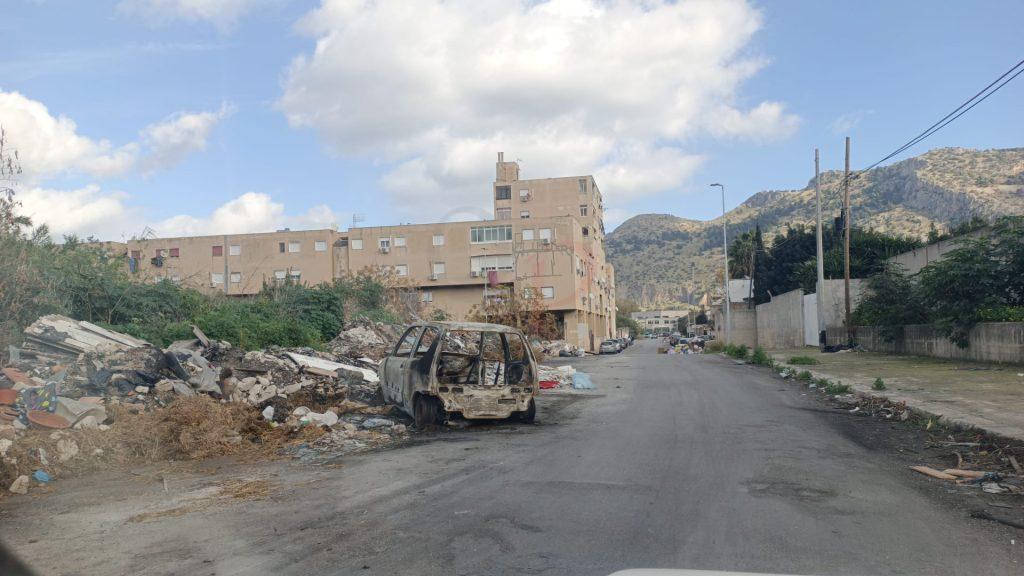 Drammatica la situazione dei rifiuti allo Zen 2, dove le discariche invadono la sede stradale e rendono impraticabili i marciapiedi. In uno scenario surreale spiccano le carcasse di auto abbandonate dopo averle incendiate in questa periferia dimenticata da tutti.