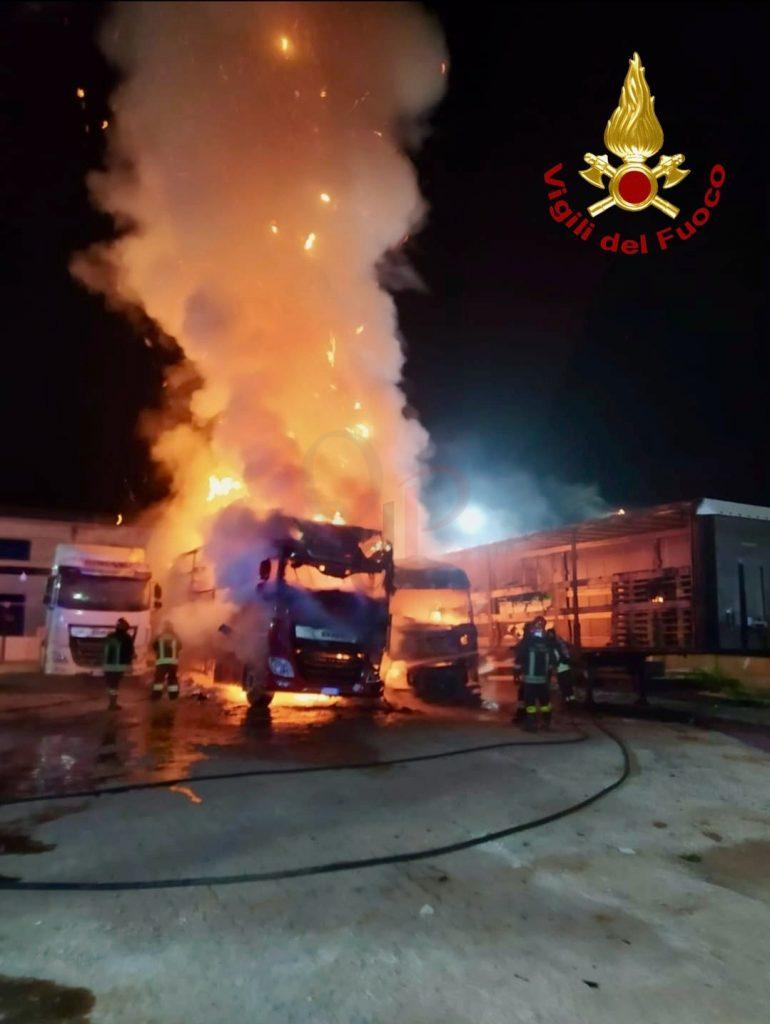 L’incendio ha inghiottito tre tir che si trovavano posteggiati nell’area interessata dalle fiamme. Uno dei due rimorchi era vuoto mentre i restanti rimorchi avevano un carico di bancali contenenti carta per la casa.