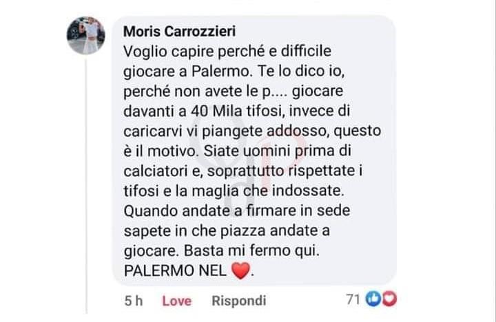 Tra i tifosi che hanno voluto dire la loro sulle dichiarazioni di Brunori, senza troppi giri di parole, anche ex illustri giocatori rosanero tra cui Moris Carrozzieri con un commento ad un post tramite il suo profilo facebook: “Voglio capire perché e difficile giocare a Palermo. Te lo dico io, perché non avete le p…. di giocare davanti a 40 Mila tifosi – ha scritto l’ex difensore rosanero – invece di caricarvi vi piangete addosso, questo è il motivo. Siate uomini prima di calciatori e, soprattutto rispettate i tifosi e la maglia che indossate. Quando andate a firmare in sede sapete in che piazza andate a giocare. Basta mi fermo qui. Palermo nel cuore”.