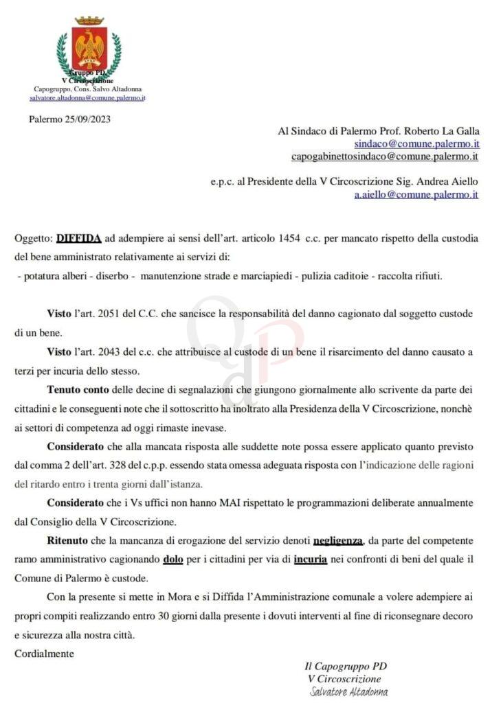 Altadonna teme che la sua diffida inviata all’amministrazione cada nel silenzio: “In tal caso mi proccuperò di inviare per competenza la medesima diffida al Prefetto ed al Questore, affinché le istituzioni ad ogni livello si sentano chiamate in causa a difesa dei cittadini. Successivamente si vedrà, molto dipenderà dalla capacità di indignarsi e di reagire dei palermitani. Spero che i miei colleghi delle altre circoscrizioni vogliano supportare questa iniziativa che il gruppo consiliare ha ritenuto di portare avanti in accordo con il segretario del circolo Marcello Riccobono, anche per sottolineare un’opposizione decisa a questa amministrazione”.