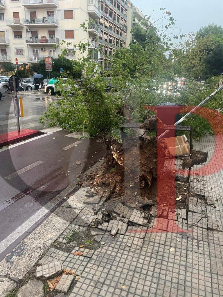Sul posto sono intervenuti i vigili del fuoco e la polizia municipale, che hanno messo in sicurezza l’area e avviato le operazioni per la rimozione del tronco e dei rami. Disagi alla viabilità si stanno registrando in altre zone della città a causa della pioggia e di diverse strade allagate.