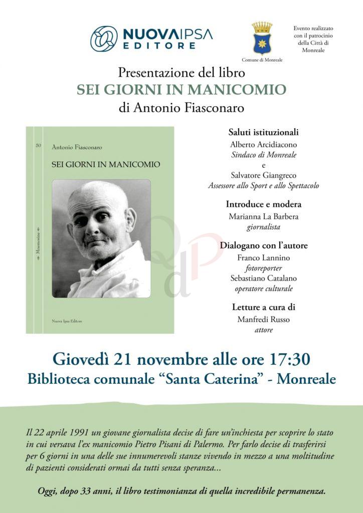 “Sei giorni in manicomio” è il titolo del libro del giornalista e scrittore Antonio Fiasconaro, che sarà presentato alla Biblioteca comunale “Santa Caterina” in via Pietro Novelli 5 a Monreale, in provincia di Palermo, giovedì 21 novembre alle 17:30.