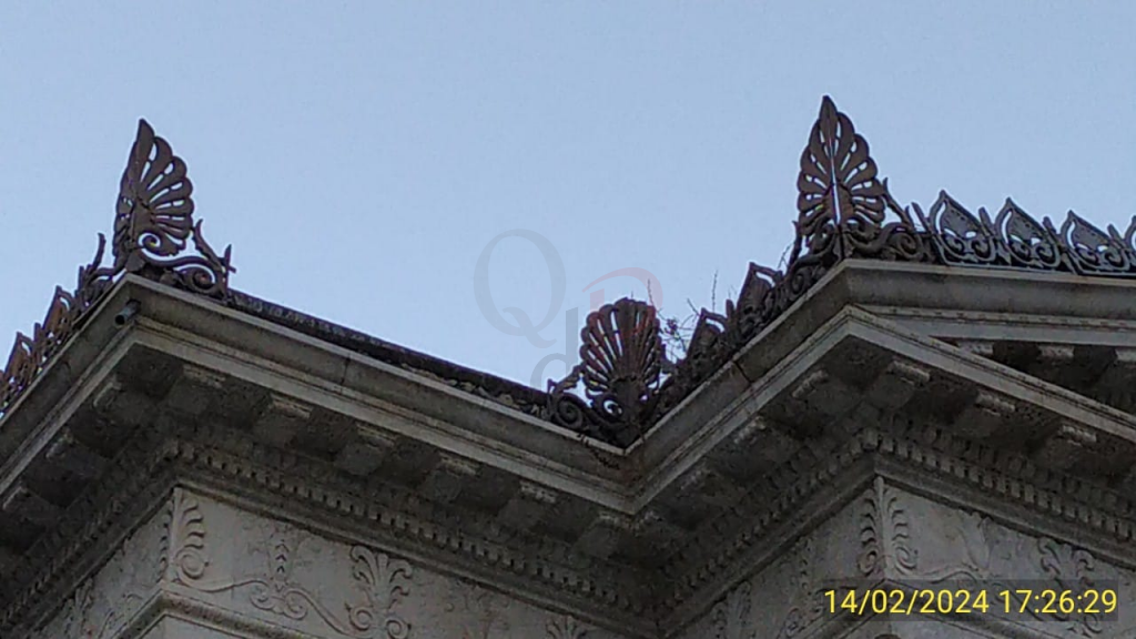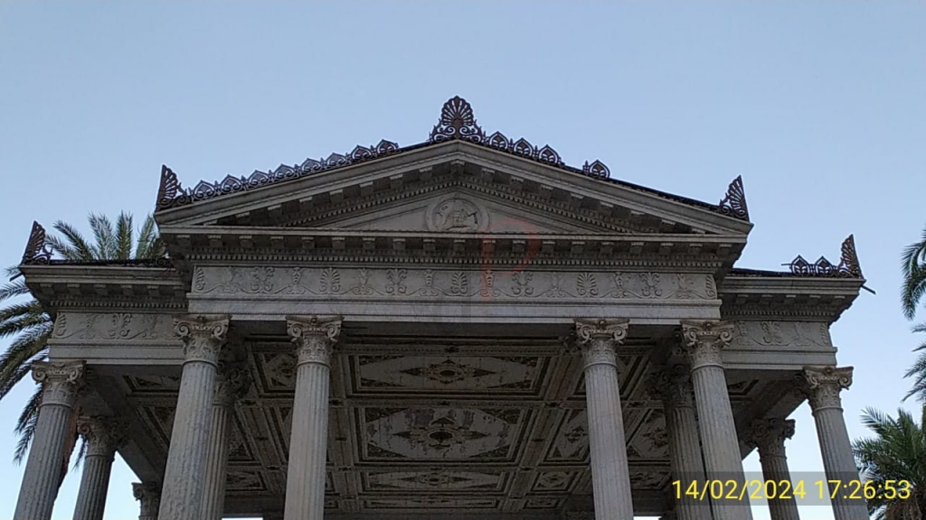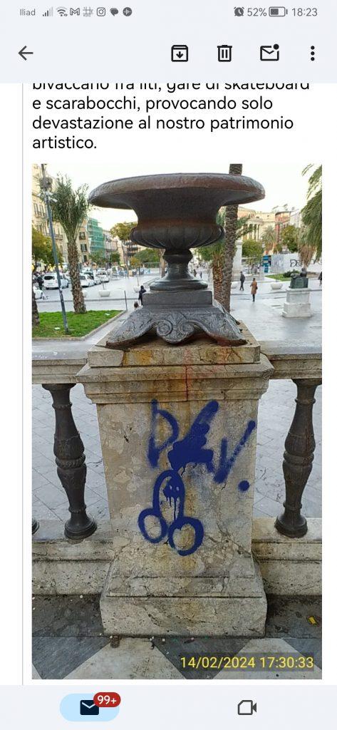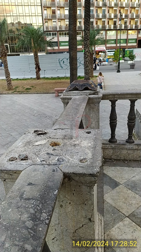 L’ultima pulizia del Palchetto risale al 2017, mentre non si ha notizia dei lavori di restauro annunciati quando si consentì ad “Aperol” di piazzare la ruota panoramica davanti al Politeama. Ma la cosa più grave é la sistematica distruzione dei fregi in stile Liberty che adornano il tetto del tempietto (gli ultimi sono caduti un paio di giorni fa) e la sparizione dei decori in bronzo posti sulle balaustre, dove rimangono solo i buchi e la ruggine che ha macchiato il marmo.