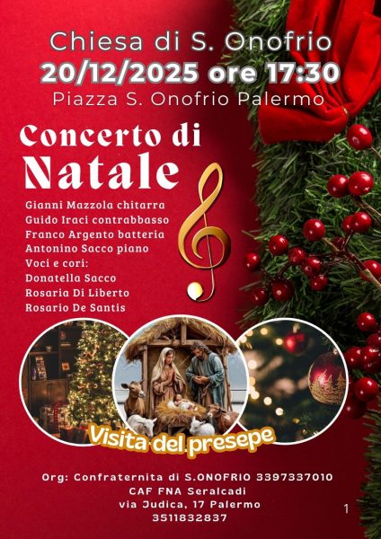 Sabato 20 dicembre 2025, alle ore 17:30, si terrà il “Concerto di Natale 2025” presso la “Chiesa di Sant’Onofrio” nell’omonima piazza di Palermo. L’evento rappresenta un momento di gioia e di festa in attesa del Santo Natale, con un programma musicale vario ed emozionante eseguito da un ensemble di musicisti e cantanti d’eccezione.