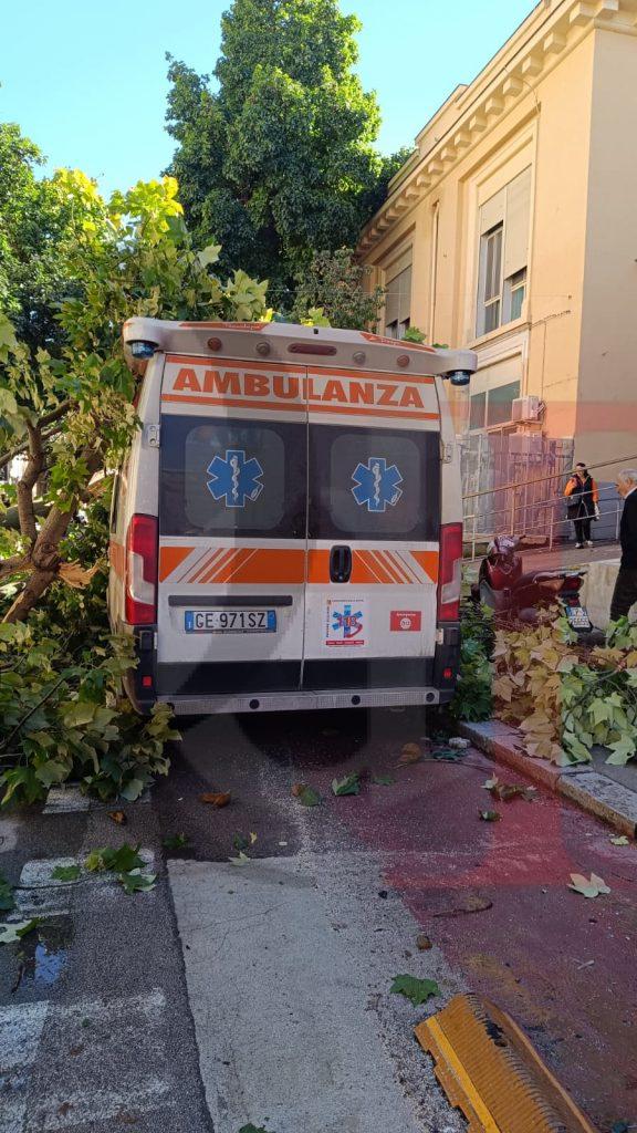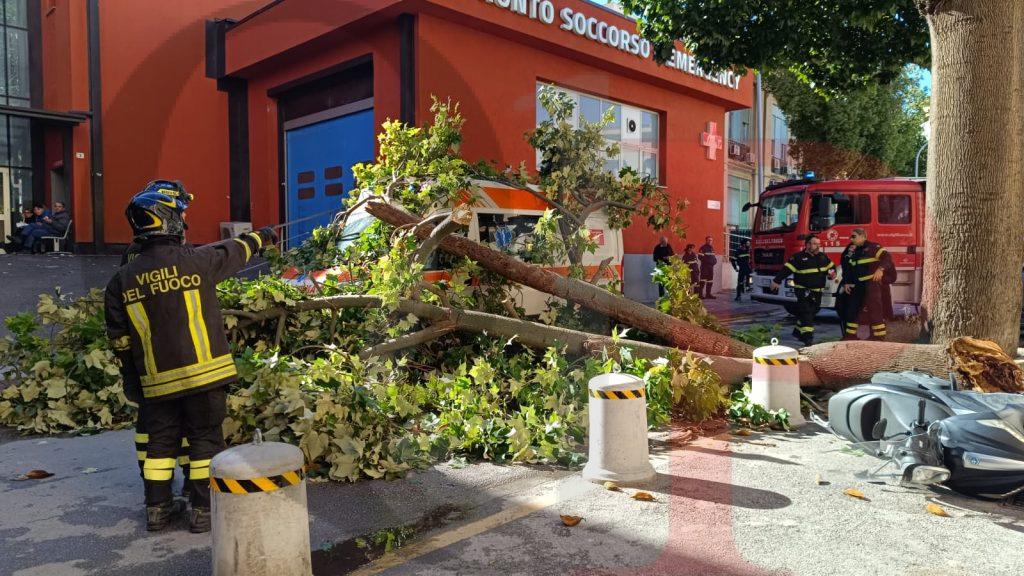 L’ambulanza colpita si trovava parcheggiata davanti al pronto soccorso, pronta a intervenire per eventuali emergenze. Il mezzo ha riportato danni alla carrozzeria, mentre lo scooter è stato centrato in pieno dal tronco e da alcuni rami spezzati ed è caduto a terra. Fortunatamente, al momento del crollo nessuno si trovava a bordo dei veicoli coinvolti né stava transitando esattamente nel punto dell’impatto.