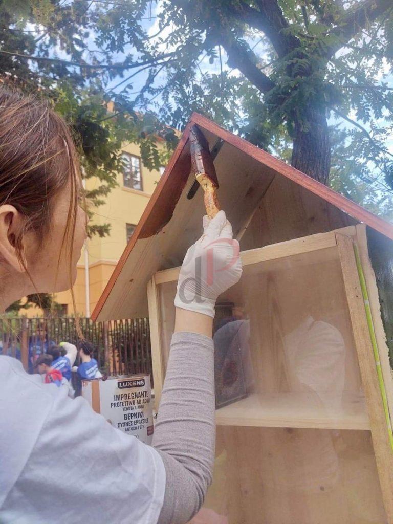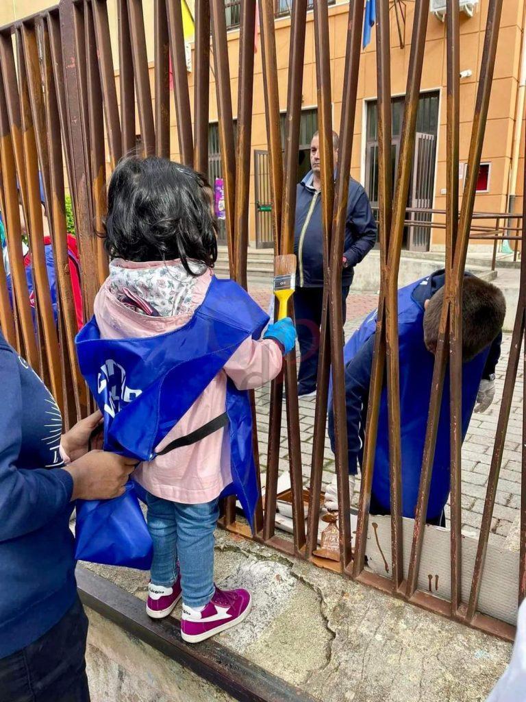 Docenti, alunni, genitori e volontari hanno ridipinto la cancellata e il muretto, hanno piantato piccole piantine e fiori e hanno piazzato una casetta per la condivisione dei libri