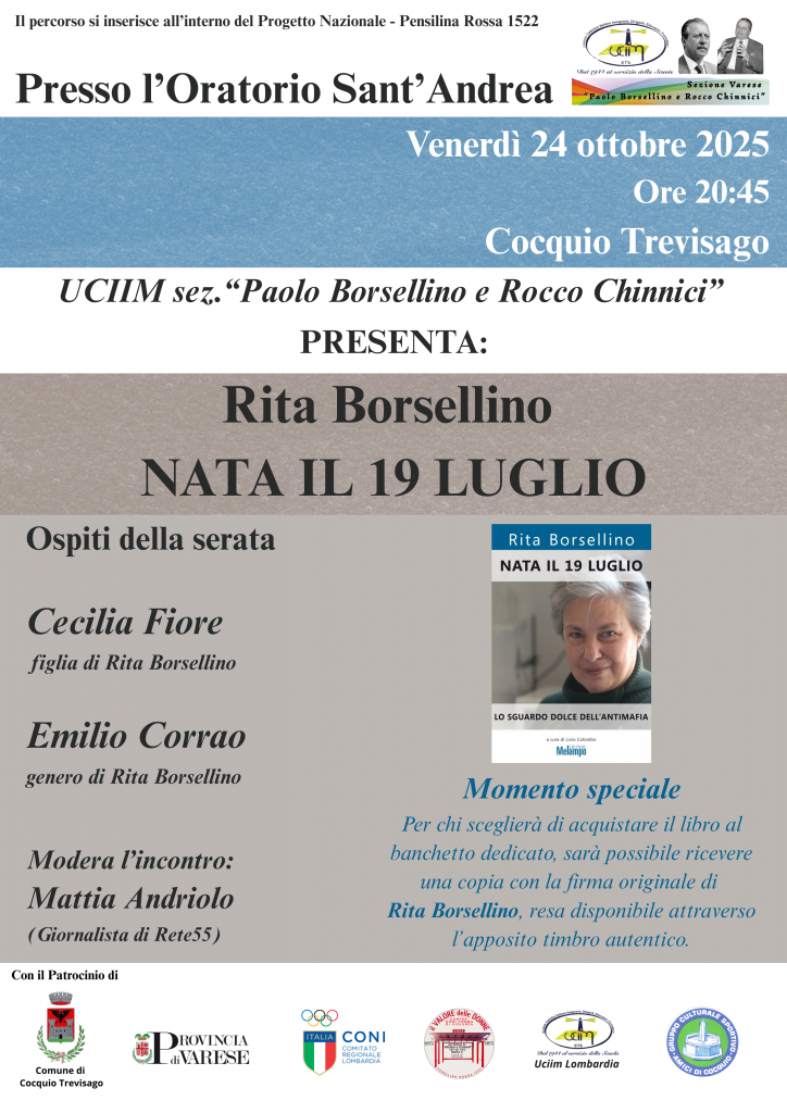 La giornata si concluderà alle 20.45 presso l’oratorio del paese, con un incontro pubblico dedicato alla memoria e all’impegno, durante il quale verrà presentato il libro “Nata il 19 luglio”, dedicato proprio a Rita Borsellino.