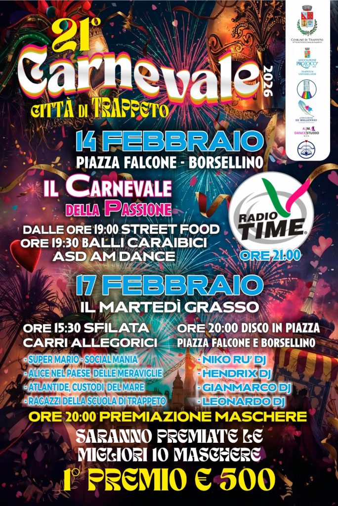 Il Carnevale di Trappeto taglia la 21ª edizione, confermandosi uno degli appuntamenti più attesi dalla città. Una manifestazione che entra nel vivo questa settimana e trasformerà il cuore del borgo marinaro in un tripudio di colori, suoni e maschere, con un ricco programma di eventi in programma per sabato 14 e martedì 17 febbraio 2026.