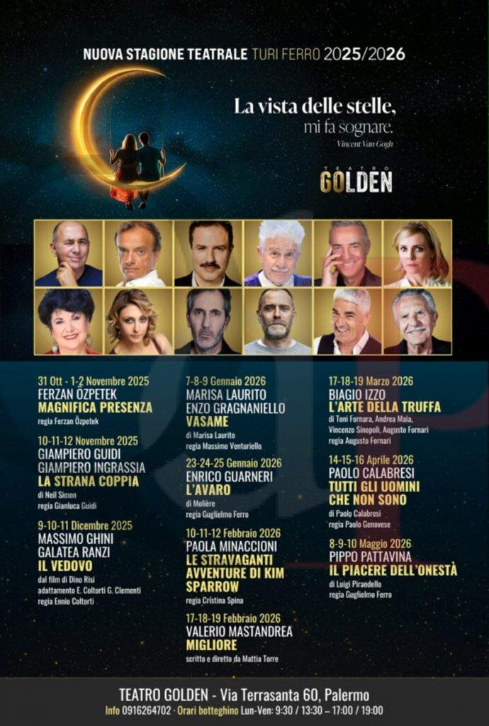 Un cartellone all stars per la nuova stagione teatrale Turi Ferro 2025-2026 al Golden di Palermo. Dall’eccellenza siciliana ai vincitori del David di Donatello nella straordinaria programmazione ospitata presso la sede di via Via Terrasanta, 60. Nomi di prima grandezza, nel panorama italiano e internazionale, per dieci imperdibili appuntamenti che spaziano tra generi e linguaggi differenti. Proposte artistico-culturali di indiscusso pregio all’insegna di un teatro sempre attuale, spettacolare sì, ma profondamente umano.