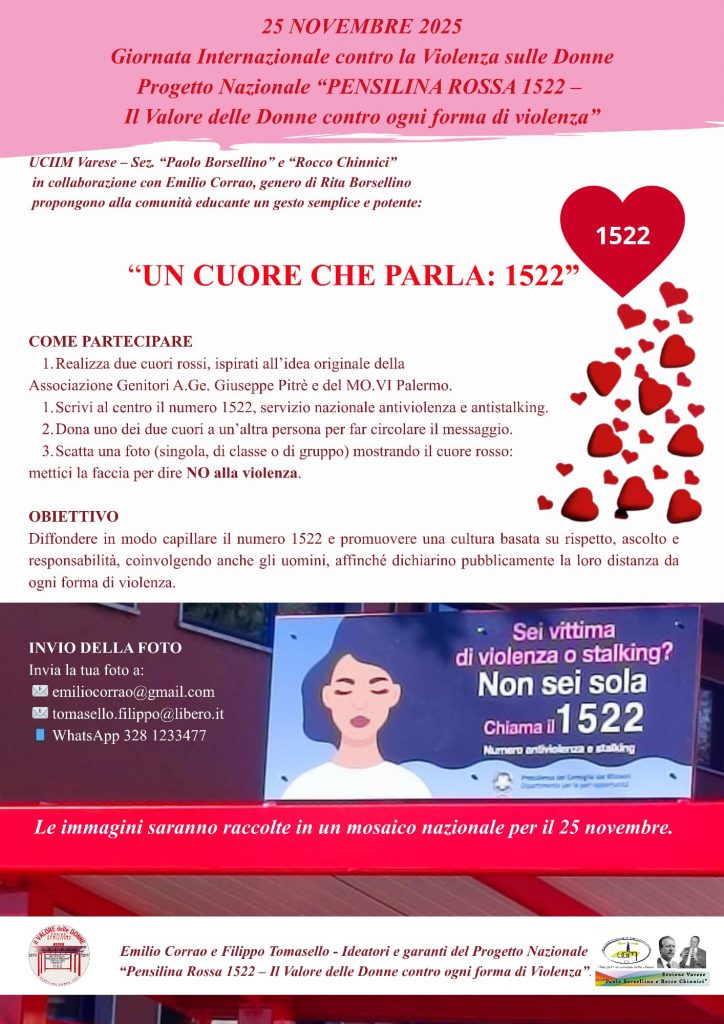 In occasione della Giornata internazionale contro la violenza sulle donne, prevista per il 25 novembre 2025, arriva da Varese un appello che sta già facendo il giro del Paese. A lanciarlo sono Emilio Corrao, palermitano, genero di Rita Borsellino, insieme alla sezione UCIIM “Paolo Borsellino e Rocco Chinnici”, promotori dell’iniziativa nazionale “Un cuore che parla: 1522”. Un invito rivolto a [coffice_banner slot="article_inline1"] dirigenti scolastici, docenti, studenti, famiglie e al personale di tutte le scuole italiane, affinché la comunità educante si riconosca unita in un gesto simbolico ma potentissimo: ricordare che il 1522 è un numero che può salvare una vita.